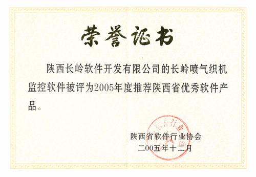 2006年1月12日,在陜西省軟件產(chǎn)業(yè)工作會議暨省軟協(xié)一屆五次會員大會上,公布表彰“2005年度優(yōu)秀軟件企業(yè)”、“2005年度推薦優(yōu)秀軟件產(chǎn)品”、“2005年度陜西省優(yōu)秀軟件人才”,我公司被授予陜西省優(yōu)秀軟件企業(yè)榮譽(yù)稱號,紡研所設(shè)計(jì)員李永紅被評為陜西省優(yōu)秀軟件人才、長嶺噴氣織機(jī)監(jiān)控軟件被評為陜西省優(yōu)秀軟件產(chǎn)品。