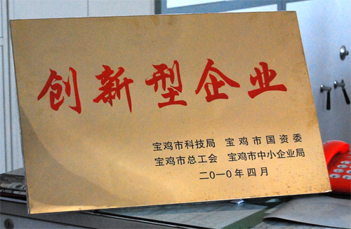 日前,在寶雞市召開(kāi)的“2010年科技工作暨重大科技項(xiàng)目評(píng)審會(huì)議”上,我公司等12家企業(yè)被命名為寶雞市創(chuàng)新型企業(yè)稱號(hào),并受到表彰。標(biāo)志著該公司的創(chuàng)新能力走在全國(guó)同行業(yè)前沿,對(duì)于進(jìn)一步增強(qiáng)企業(yè)的創(chuàng)新能力,培育知名品牌,增強(qiáng)企業(yè)的競(jìng)爭(zhēng)力起到了積極的促進(jìn)作用。