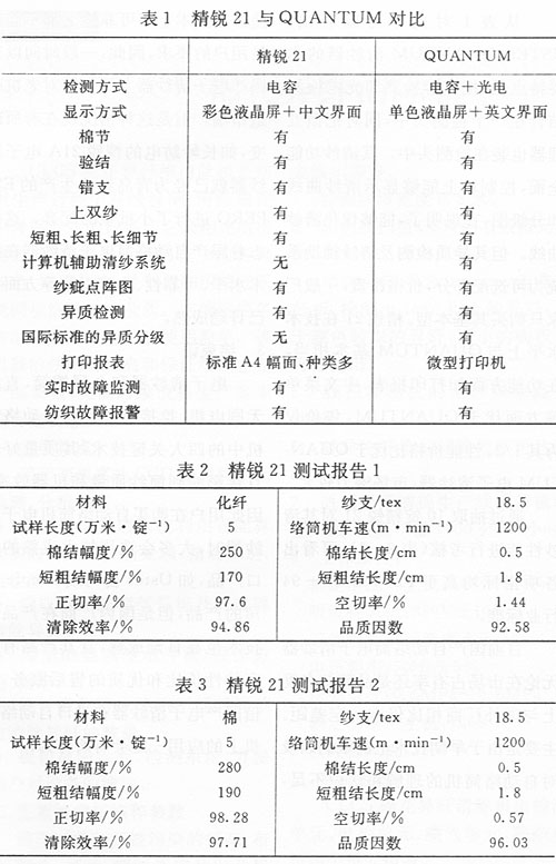 從表1對(duì)比中可以看出,USTER QUANTUM清紗器的主要特點(diǎn)是:把電容檢測(cè)和光電檢測(cè)結(jié)合在一個(gè)檢測(cè)頭中,同時(shí)把微處理器也裝在檢測(cè)頭中。其清紗功能全面,控制箱上能夠顯示清紗曲線和分級(jí)圖,直觀明了,能夠優(yōu)化清紗曲線。但其異質(zhì)檢測(cè)及清紗輔助系統(tǒng)為可選配部分,價(jià)格昂貴,一般廠家只購(gòu)買其基本型。精銳21在技術(shù)水平上與QUANTUM基本相當(dāng),在功能方面如打印報(bào)表、中文菜單等方面優(yōu)于QUANTUM,售價(jià)僅為其1/2。性能價(jià)格比優(yōu)于QUANTUM電子清紗器,市場(chǎng)潛力較大。
