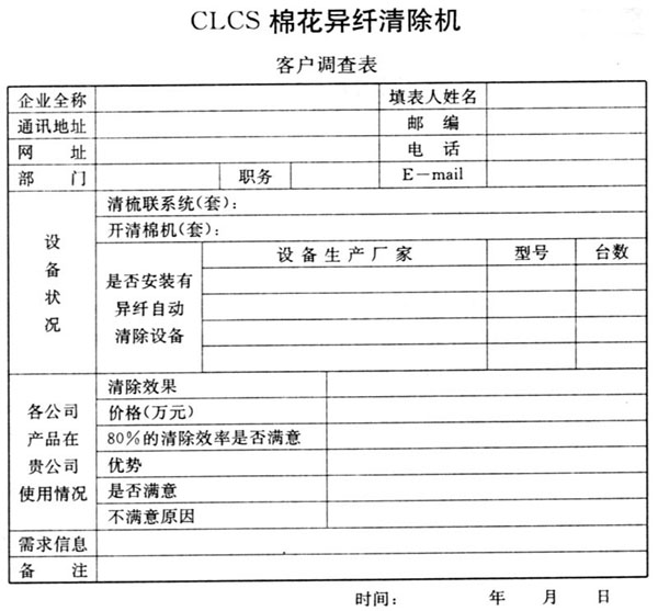 陜西長嶺紡織機(jī)電科技有限公司,已完成《CLCS-棉花異纖清除機(jī)》的研制,我公司正在收集市場信息,如果已使用過棉花異纖清除機(jī),或準(zhǔn)備上該設(shè)備的,對(duì)該設(shè)備有興趣的客戶請?zhí)畲吮?。?br>