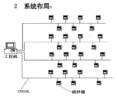 電子清紗器計(jì)算機(jī)網(wǎng)絡(luò)系統(tǒng)以一臺(tái)工控機(jī)作為上位機(jī),利用數(shù)字式電子清紗器電控箱中預(yù)留的通訊接口組成車間數(shù)據(jù)管理中心。完成分析各絡(luò)筒機(jī)臺(tái)工作狀況,編輯打印產(chǎn)量或質(zhì)量報(bào)表,修改工藝參數(shù)等工作。實(shí)現(xiàn)生產(chǎn)車間全范圍內(nèi)清紗質(zhì)量、產(chǎn)量以及絡(luò)筒設(shè)備的監(jiān)控管理。