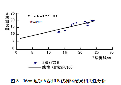 對不同棉樣分別用A法和B法測試, A法利用國家校準棉花校準,B法采用羅拉分析儀手工測試方法測試,由于B法手工測量方法取樣量小,代表性比較差,同時受客觀因素影響比較大(不同的人不同的操作手法測量結(jié)果有比較大的差異),所以兩個方法的測量結(jié)果不盡相同,但二者具有很好的相關性,兩個方法的測量結(jié)果見表2,相關性分析見圖3。從圖3可以看出,A法在用國家校準棉花校準后,測試結(jié)果和B法測試結(jié)果相關性很好(相關系數(shù)達0.9以上)。