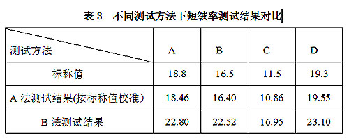 B法檢測過程中,因檢測人員的目光、手法,取樣量大小等人為因素而影響測試結(jié)果;而A法由于取樣量大代表性強,所以具有一定的準確性。表3是4種具有短絨標稱值的棉花,用兩種方法的測試結(jié)果,可以看出,快速短絨測試儀的16mm重量短絨測試結(jié)果正確性較好。