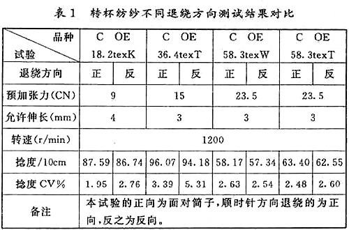 長嶺紡織機電科技有限公司研制生產(chǎn)的YG156A全自動紗線捻度儀,測試過程全自動,操作穩(wěn)定,重復(fù)性強,排除了人工引紗帶來的操作誤差,比較準(zhǔn)確地反映了紗線退繞對捻度測試的影響。我們?yōu)I州實驗室選用的正是YG156A全自動紗線捻度儀。下面通過一組轉(zhuǎn)杯紡紗在不同退繞方向下的檢驗結(jié)果對比,論證不同方向的紗線退繞對捻度測試的影響。檢驗結(jié)果見表1。