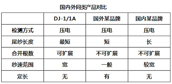 目前,國外較先進的并紗機斷紗檢測器的主要優(yōu)點是:壓電式測量,采用微處理技術,性能好,可靠性高,并紗支數(shù)可達120Nec,分級處理,但價格昂貴。國產壓電式斷紗檢測器,處理器采用數(shù)字式硬件方式,最高并紗支數(shù)可達134Nec,但可靠性低,并紗根數(shù)錠數(shù)配置固定,不易擴展。長嶺紡電DJ-1/1A斷紗檢測器的主要性能指標均處于優(yōu)先水平,某些項目 達到或超過了國際先進水平。 下表列出了國內外的斷紗檢測器對比情況。