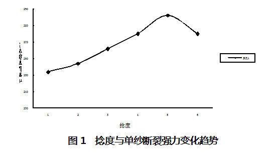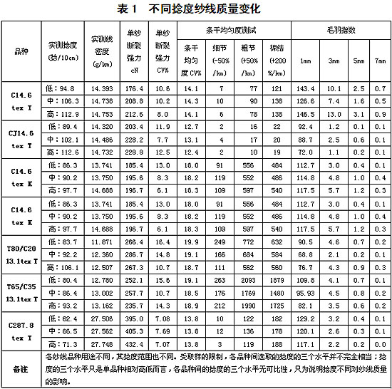 捻度是衡量紗線加捻程度的一項(xiàng)參數(shù),是紗線成形卷繞、賦予紗線強(qiáng)力的基本條件。通常在紗線捻度工藝的調(diào)整中,多時(shí)只關(guān)注到捻度變化對單紗斷裂強(qiáng)力、單紗斷裂伸長率的影響,而或忽略了捻度變化對紗線線密度、條干均勻度CV%、粗節(jié)、細(xì)節(jié)、棉結(jié)、毛羽等項(xiàng)目的因果關(guān)系;忽視了紗線捻度變化對紗線其它質(zhì)量變化的影響,未能采取全面質(zhì)量控制措施,由此引起客戶對紗線質(zhì)量不滿意,帶來不應(yīng)有的貿(mào)易損失。