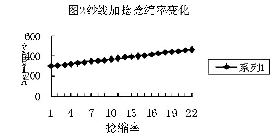 須條經(jīng)過前工序加工,原先伸直平行的纖維與紗軸發(fā)生傾斜,纖維在須條上呈螺旋形排列。須條加捻程度不同,纖維在須條中的彎曲不同,紗線片段因紗線捻度增加纖維彎曲增大,導(dǎo)致同纖維量的紗線片段長度相比前羅拉輸出須條長度變短,即產(chǎn)生捻縮。捻系數(shù)與捻縮率關(guān)系(如圖2)。