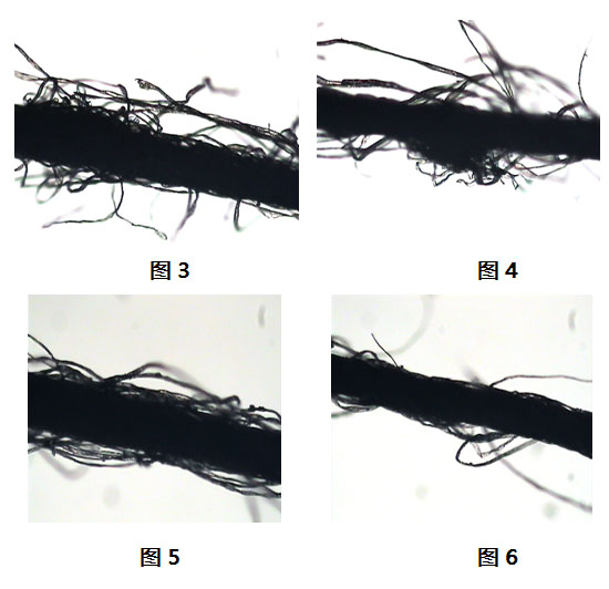 3.4.2 紗線在加捻過程中產(chǎn)生的紗線毛羽會(huì)隨著捻度的增加而減少,繼續(xù)加捻后因紗線卷繞及向心力的作用,一些伸出紗線主體的毛羽被包纏在須條主體內(nèi),或毛羽的一部分卷繞在紗線主體上,毛羽數(shù)量及長度發(fā)生變化(見圖6),可看出毛羽數(shù)量