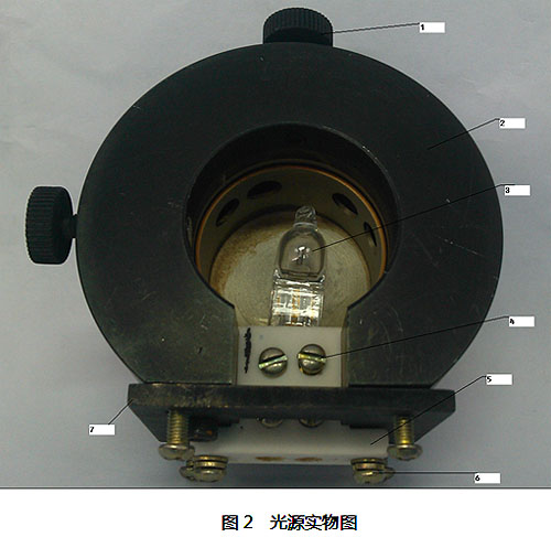 在色澤儀電控箱斷電的情況下參照圖1,將光源安裝座鎖緊螺釘(兩個,不需要擰掉)全部擰松。就可用從色澤儀主體上拿下光源安裝座,光源就安裝在光源安裝座中,如圖2所示。