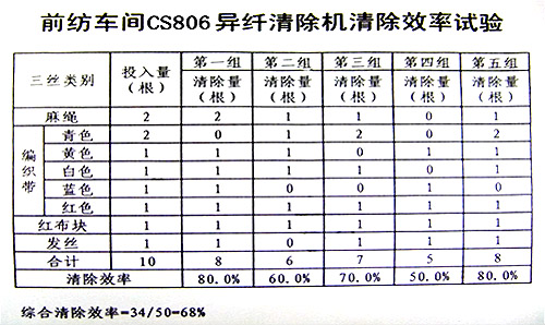 分析清除效率,設(shè)備正常生產(chǎn)中,在異纖機(jī)前級(jí)開(kāi)棉機(jī)出口投入標(biāo)準(zhǔn)考核異纖樣本,從廢棉中撿出的樣本與樣本總投入數(shù)量的比值。