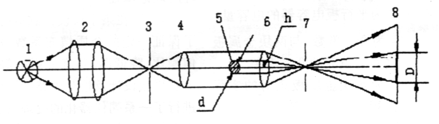 光電式條干測量是在紗線快速通過檢測區(qū)且紗線本身有抖動(dòng)的狀態(tài)下進(jìn)行的非接觸瞬時(shí)測量,所以測量的光學(xué)系統(tǒng)應(yīng)是一個(gè)遠(yuǎn)心光路系統(tǒng)。其原理如圖2所示,光源1經(jīng)過聚光透鏡2聚焦于光欄3,由準(zhǔn)直物鏡4形成準(zhǔn)直光束,對紗線5作背景照明,再經(jīng)投影物鏡6在光電接收器靶面上形成放大的陰影像D,對這個(gè)陰影像進(jìn)行測量,可達(dá)到紗線直徑測量之目的,此方法也稱投影放大法。在光學(xué)上,紗線直徑測量可用下式表達(dá):