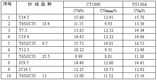 使用陜西長嶺紡織機(jī)電科技有限公司生產(chǎn)的YG136A條干均勻度測試分析儀和CT1000紗線外觀分析儀對10種紗線進(jìn)行測試,