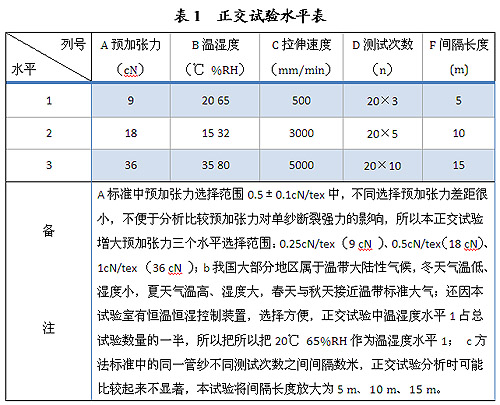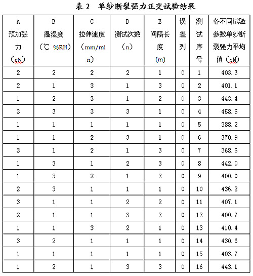 以上測試參數(shù)均對單紗斷裂強力測試偏離產(chǎn)生影響,這些因素對單紗斷裂強力的影響各不相同。為科學、準確、嚴謹?shù)乜刂聘鳒y試參數(shù),減少測量不確定度,我們應(yīng)用正交試驗,對單紗斷裂強力各測試參數(shù)進行分析比較,依據(jù)不同參數(shù)對測試結(jié)果的不同影響設(shè)置測試參數(shù),以此提高單紗斷裂強力準確性和可靠性。