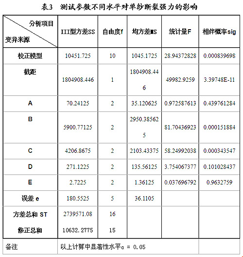 由F分布給出的因子A、因子D、 因子E相伴概率均大于0.05,說明三因子在顯著性水平ɑ = 0.05上與上對測試結(jié)果的影響勻不顯著,并且其中因子A、因子E均小于誤差e=180.5525,是影響單紗斷裂強力各參數(shù)中最小的兩個因子。以上三因子對于單紗斷裂強力的貢獻大小,與樣本本身的離散性大小直接相關(guān),本案例預(yù)加張力小于測試次數(shù)的III型方差,或緣于這個樣本的離散性。