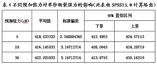 標準規(guī)定的單紗斷裂強力施加0.5±0.1cN/tex,對于一個測試樣品而言,標準給出的不是一個確定值,而是一個可以選擇的范圍。按照標準規(guī)定的預(yù)加張力,它可以施加0.5cN/tex的預(yù)加張力,也可以施加0.4cN/tex、0.6cN/tex的預(yù)加張力。通過正交試驗可以看出,不同的預(yù)加張力對單紗斷裂強力產(chǎn)生不同的影響,見表3,同一個樣品因預(yù)加張力的選擇不同由此產(chǎn)生測量不確定度,這也成為不同試驗室測試同一樣品測試結(jié)果不一致的原因之一。不同預(yù)加張力對單紗斷裂強力的影響見4。