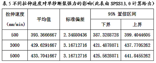 從正交試驗表3可以看出,拉伸速度產(chǎn)生的III型方差SS為5900.77125,是正交試驗中影響最大的因子,不同拉伸速度對單紗斷裂強力的影響見表5。GB/T3916-2013規(guī)定采用500mm/min的拉伸速度,“僅對自動試驗儀,根據(jù)協(xié)議允許較高的拉伸速度。我國的單紗斷裂強力測試方法從原來的定時斷裂20s,發(fā)展到現(xiàn)在的等速拉伸;而我國的紡織織造也從原來的有梭織機,發(fā)展到現(xiàn)在的劍桿織機、片梭織機、噴水織機、噴汽織機;引緯速度也從有梭織機的240m/min左右發(fā)展到無梭織機的1900m/min左右,織造速度較原來有了很大提高,織造過程中紗線的受力情況發(fā)生很多變化。從標準反映實際應(yīng)用角度講,GB/T3916規(guī)定的500mm/min不能與現(xiàn)在的織造速度相應(yīng),測試結(jié)果對現(xiàn)實生產(chǎn)的指導(dǎo)意義由此受到影響。建議采用400%的隔距長度每分鐘或者1000%的隔距長度每分鐘的拉伸速度”,也即可采用2000mm/min與5000mm/min的拉伸速度。