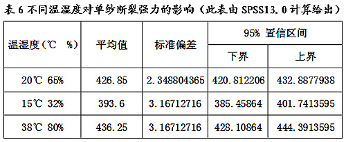 從正交試驗表3可以看出,不同溫度產(chǎn)生的III型方差SS為4206.8675,是正交試驗影響單紗斷裂強力僅次于拉伸速度的因子,不同溫濕度對單紗斷裂強力的影響見表6。