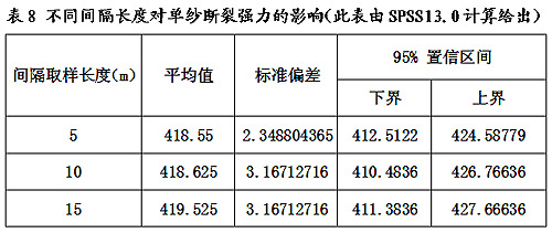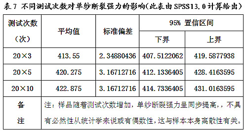 采用不同的管紗數(shù)量與不同的測試次數(shù),及不同測試次數(shù)間隔長度不同,關(guān)系到樣本采用與利用的程度,關(guān)系到測試信息的是否充分,這些都會賦予單紗斷裂強力測試的測量不確定度,影響到對于一批紗線產(chǎn)品評估的準確性和可靠性。測試次數(shù)與間隔長度不同對單紗斷裂強力的影響到見表7、表8。