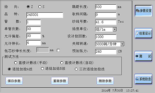 2.將管紗通過紗架引紗到主機(jī)換紗架上之后,即可開始測試。在開始測試之前,應(yīng)在觸摸屏參數(shù)設(shè)置界面上設(shè)置相關(guān)參數(shù)。